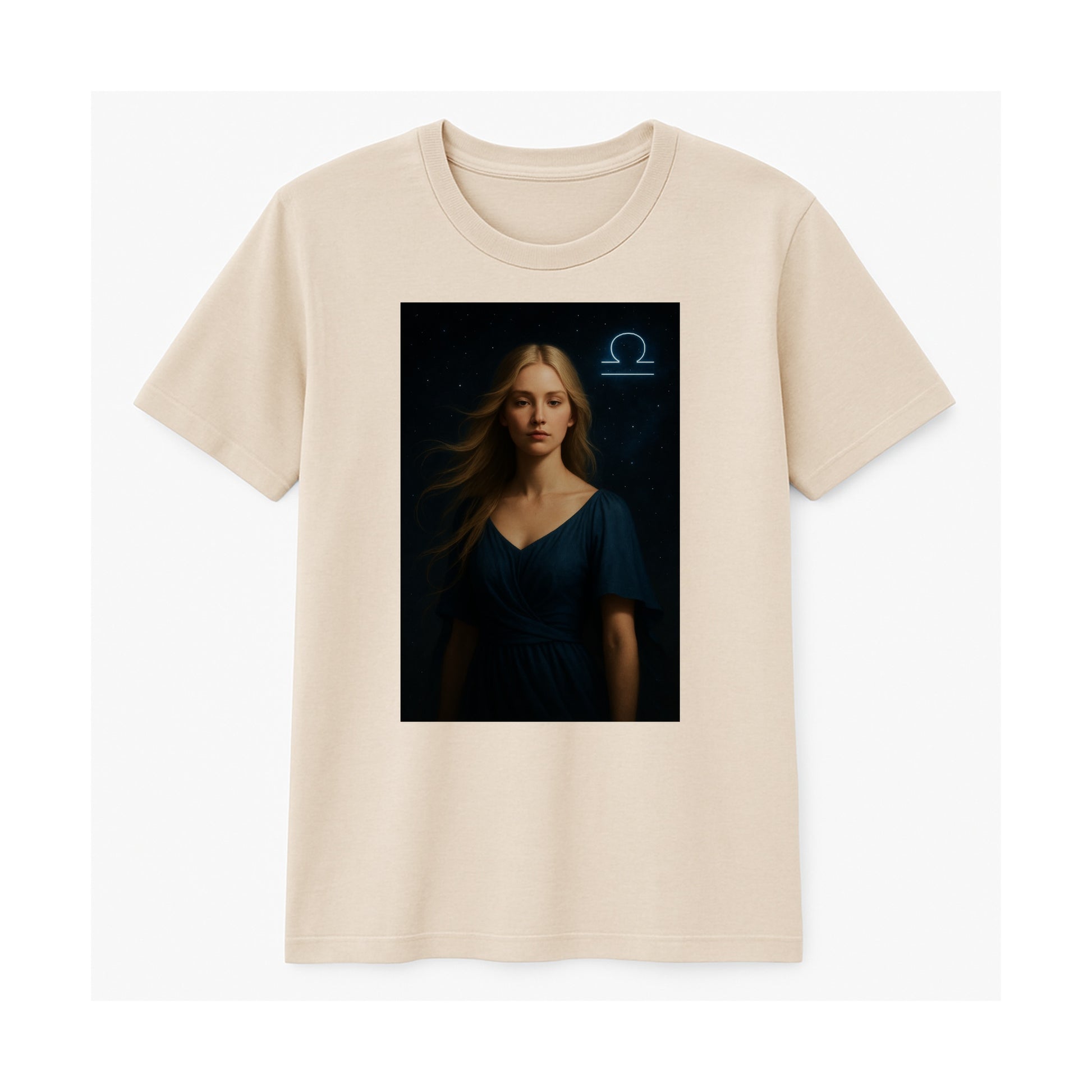 A graceful piece from the PRISTANO Zodiac Collection. This beige t-shirt features a serene Libra portrait – a woman in deep balance, bathed in moonlight, beneath the glowing Libra symbol in a starry sky.